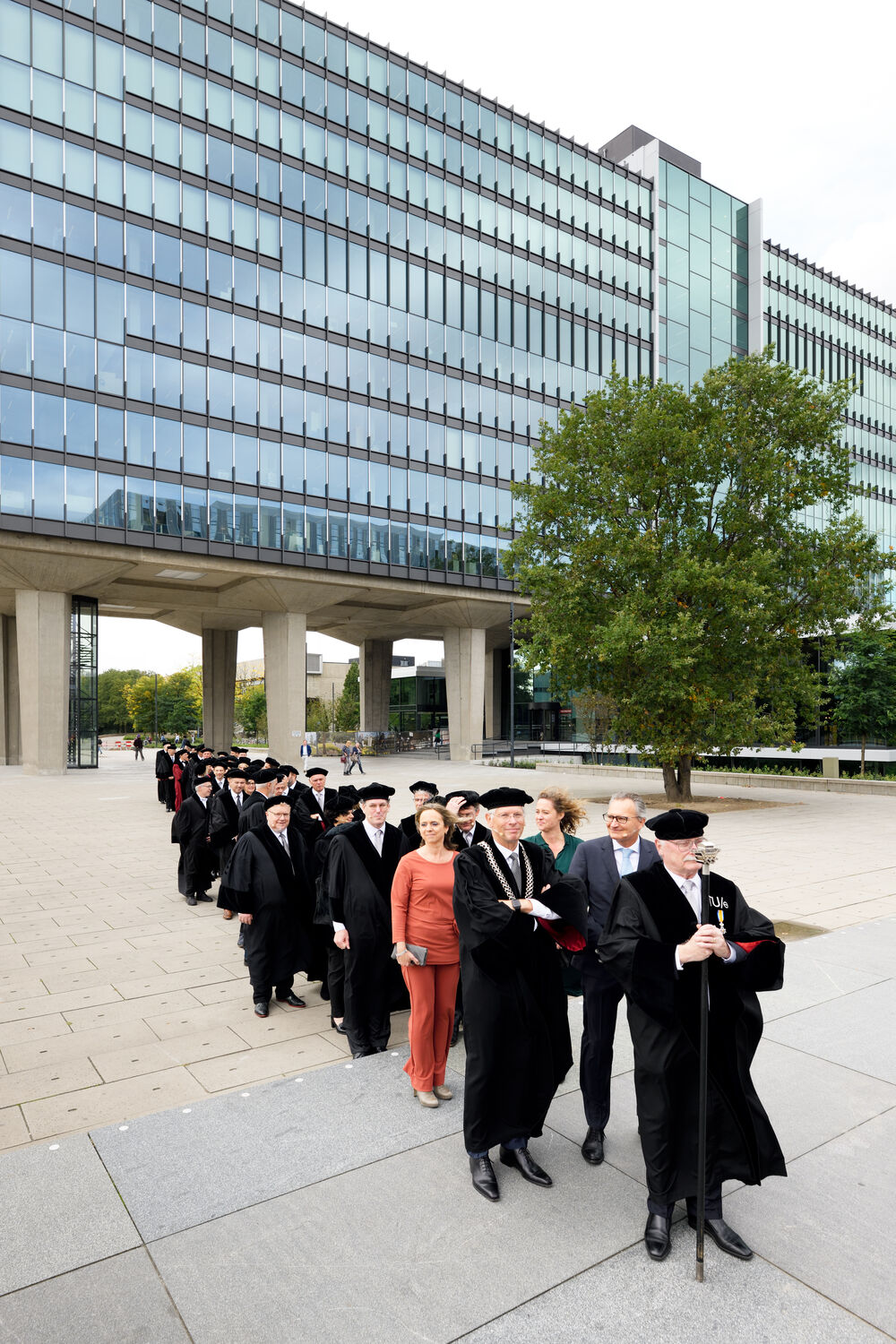 Waar mensen misschien toch het eerst aan denken bij rituelen en tradities op een universiteit is de ceremoniële kledij. De toga en baret die gereserveerd zijn voor hoogleraren vallen natuurlijk gewoon erg op. En dat is ook de bedoeling. Joep Huiskamp, beleidsmedewerker en adviseur van het College van Bestuur, weet veel over de geschiedenis van de universiteit: “De ceremoniële gebaren en tradities rond de universiteit vinden hun oorsprong in middeleeuwen. Iemand die zo’n toga draagt, geeft daarmee aan dat hij of zij een bepaalde positie inneemt: hij wordt gevolgd. Dat was en is de essentie van de universiteit: studenten volgden iemand die heel veel weet van bepaald onderwerp. Dat idee lijkt nog altijd heel erg op de hiërarchie in de kerk en in kloosters. En als je eenmaal zo’n ding aan hebt, gebeurt er iets. Dat voelt de togadrager. Die uitstraling markeert echt een moment.”