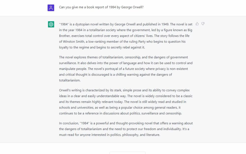 Cursor heeft ook een paar (simpele) vragen gesteld aan de bot. Waaronder het genereren van een boekverslag van 1984 van George Orwell. Toen Cursor niet tevreden was met onderstaande korte boekverslag en de command ‘longer’ gaf, kregen we plots een veel langer en meer gedetailleerd verslag. Klik op de afbeeldingen om ze te vergroten.