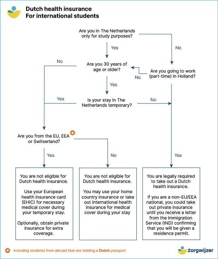 - Voor internationale studenten is er een handig stroomschema dat je helpt beslissen of je een Nederlandse zorgverzekering nodig hebt en/of daarvoor in aanmerking komt: