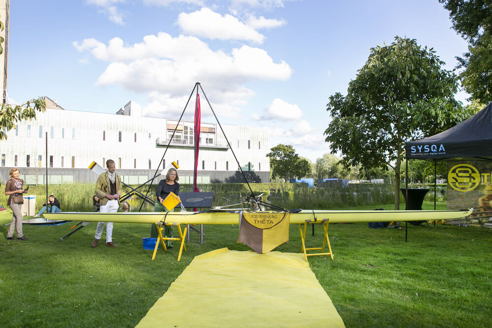 Voor de fotoserie pakt Robert een boot uit het rek. Hij kiest uit de 73 boten die roeiklaar in de loods liggen MomenTUm, een boot waarin hij veel geroeid heeft. In totaal heeft de vereniging 172 boten (gehad) die namen kregen tijdens een doopceremonie, meestal door ereleden of andere prominenten. Een boot zonder naam brengt ongeluk, weet iedere roeier. Op 30 augustus mocht Nicole Ummelen nog een boot dopen tijdens haar afscheid van de TU/e. De naam is gekozen door het Thêtabestuur: Mens Agitat Molem. Dat is het motto van de TU/e.