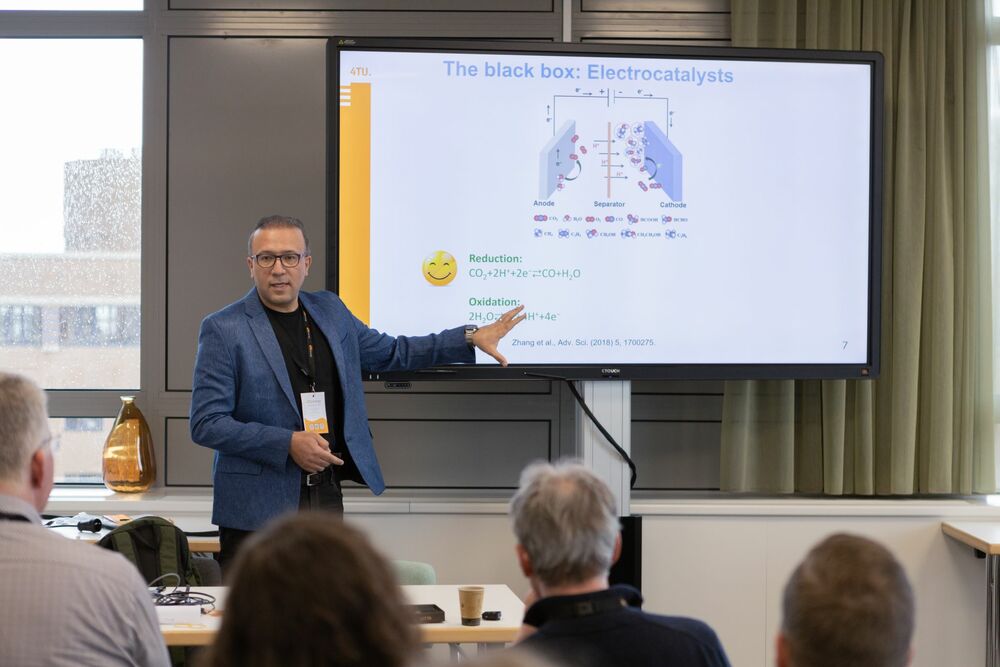 Na de lunch wordt het programma vervolgd met pitches van projecten die gefinancierd zijn door de federatie. Peyman Taheri, onderzoeker van TU Delft, vertelt over een innovatieve technologie die de natuurlijke koolstofkringloop nabootst en zorgt voor het afvangen van CO2 uit de lucht om het vervolgens te gebruiken voor de productie van iets nuttigs. In zijn onderzoek kijkt hij hoe je door gebruik van zogenaamde elektrokatalysatormaterialen CO2 via elektrochemische processen om kunt zetten in synthetische brandstoffen.
