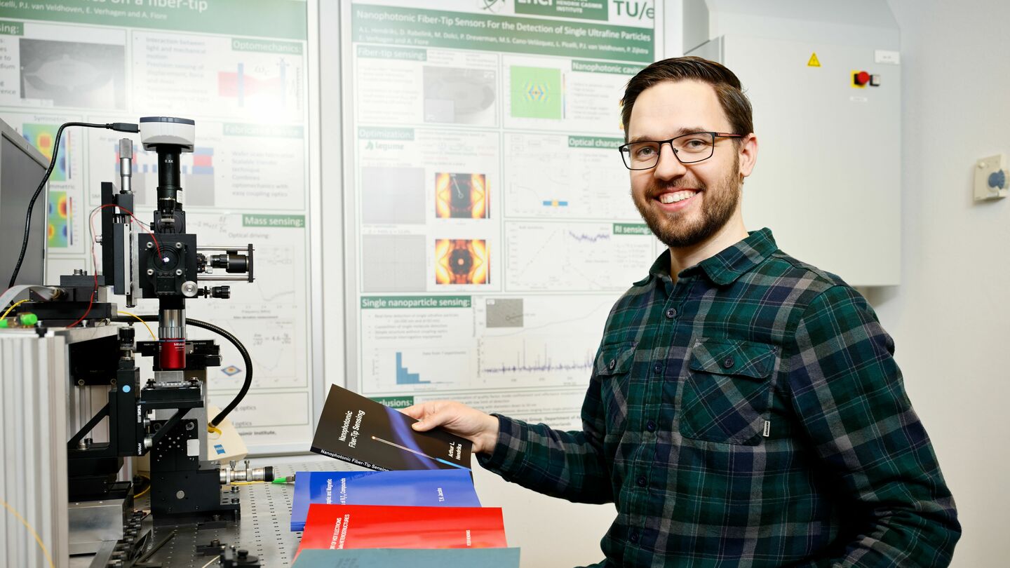 Zijn opa en vader gingen hem voor, achter de katheder bij dezelfde universiteit én faculteit. Vandaag is het de beurt aan Arthur Hendriks om zijn proefschrift te verdedigen. Vier jaar lang optimaliseerde hij aan de faculteit Applied Physics & Science Education hoe je optische sensoren zonder lijm aan een glasvezel kunt plakken, en verwacht binnenkort de eerste toepassingen. “Ons sensorsysteem is simpel, flexibel en heel gevoelig.”