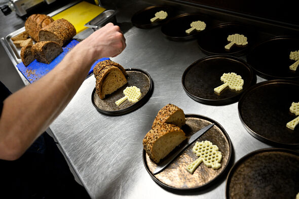 De kok neemt ons mee in de keuken waar de printer net bezig is boompjes van boter te printen. Doordat de laagjes flinterdun zijn, doet de printer er wel twintig minuten over om zes stuks te printen. Om de gasten niet te lang te laten wachten op hun voorafje, worden de vormpjes al ruim van tevoren geprint en in de vriezer bewaard. Kort voor het serveren worden de boterboompjes op borden gelegd, zodat ze ontdooien.