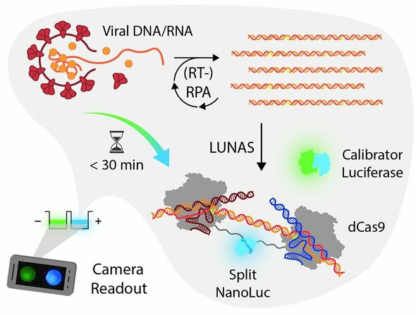 Om ervoor te zorgen dat de blauwe lichtreactie alleen plaatsvindt wanneer het doel-DNA/RNA (bijvoorbeeld van het coronavirus) aanwezig is, is de blauwe luciferase uit de garnaal (NanoLuc) in twee delen gesplitst. Ieder deel is gekoppeld aan een eiwit dat het doel-DNA/RNA op kan sporen (het CRISPR-eiwit genaamd dCas9).
