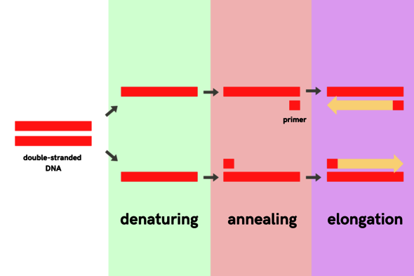PCR bestaat uit drie stappen: denaturatie, annealing en elongatie. Om hieraan te beginnen is een DNA-template nodig. Het genetisch materiaal van het coronavirus bestaat uit RNA. Dit lijkt op DNA, maar bestaat niet uit een dubbele streng maar een enkele. Bovendien heeft RNA net iets andere bouwblokken dan DNA. Door behandeling met het enzym ‘reverse transcriptase’ wordt het RNA omgezet naar DNA, hierna kan de PCR beginnen.