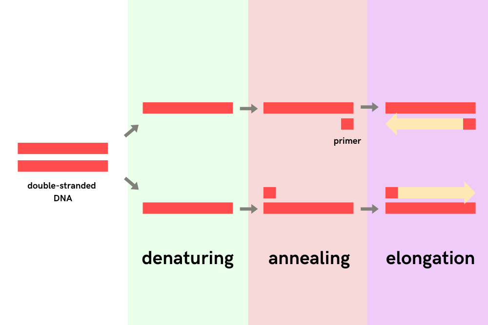 De hoeveelheid genetisch materiaal is vaak minimaal op zo’n wattenstaafje. Zo weinig dat er niet betrouwbaar getest kan worden of je besmet bent of niet. PCR is een methode om uit kleine hoeveelheden genetisch materiaal (zoals op het wattenstaafje) een specifiek gedeelte heel vaak te vermenigvuldigen. Net zo lang tot dat er voldoende aanwezig is om het te kunnen detecteren. Dit kopieerproces gebeurt aan de hand van een drietal stappen die heel vaak herhaald worden. Hierbij worden de twee DNA-strengen eerst bij hoge temperaturen uit elkaar ‘gesmolten’, waarna bij lagere temperaturen de specifieke DNA-sequentie wordt afgebakend en gekopieerd.