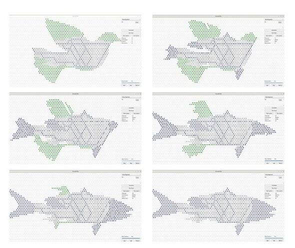 En dat is gelukt. Waar de Amoebots eerst een tussenvorm moesten aannemen - bijvoorbeeld in een lange rij - voordat ze in een nieuwe vorm over konden gaan, kan dat nu op een rechtstreekse manier. Peters laat een video zien van zo’n directe vormverandering. Op zijn scherm verschijnt een groep stipjes, in de vorm van een duif. Gecoördineerd verschuiven ze vervolgens van positie, totdat er een vis in beeld is. “Het lijkt misschien een onzinnig filmpje, dat je van een duif een vis kunt maken. Maar het achterliggende idee is uniek. Met deze nieuwe algoritmes hebben we echt een stap kunnen zetten om robots efficiënter gezamenlijk te kunnen laten bewegen.”