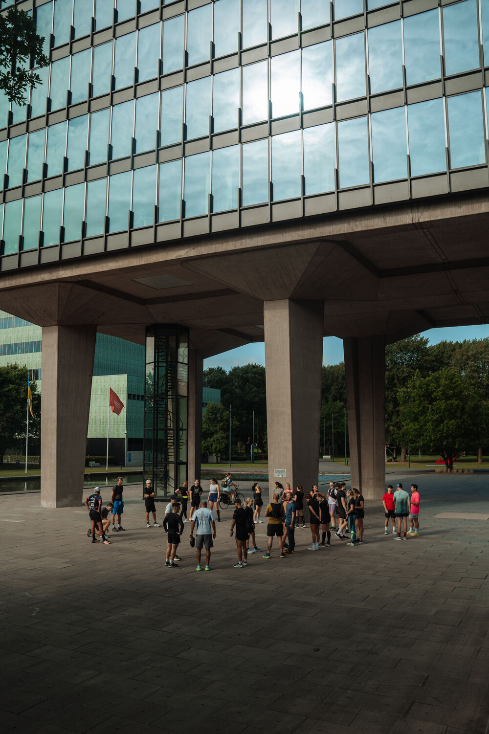 De route begint tussen de pilaren van Atlas, door de Markthal en verder over de campus richting de Karpendonkse plas. Terwijl het begint te schemeren, wordt er nog volop met elkaar gesproken. Over wat iedereen voor studie en werk doet, persoonlijke doelen en soms wat smalltalk. Er rent een PhD-kandidaat mee, die onderzoek doet naar Russische en Oekraïense propaganda. De ander is druk bezig met haar studie HR-management. Een user experience designer is twee jaar geleden afgereisd naar Eindhoven. Ze vindt het een topstad.