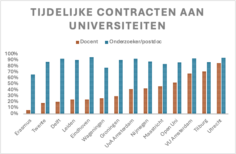 Het contrast is nog groter bij de docenten zonder onderzoekstaak. In Utrecht heeft 85 procent van hen een tijdelijk contract, tegen slechts 6 procent in Rotterdam. Hier zit de Erasmus Universiteit dus aan de andere kant van het spectrum.