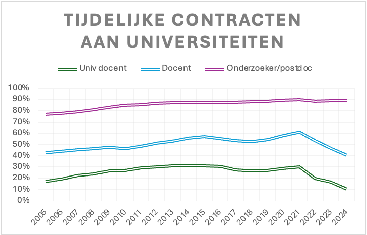 Voor ‘universitair docenten’ hebben de vakbonden en het vorige kabinet flinke vooruitgang geboekt. UD’ers werken minder vaak op een tijdelijk contract: in drie jaar tijd ging het van 30 naar 11 procent.