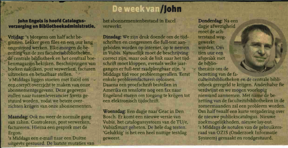Het reilen en zeilen van een universiteit is geen sinecure. Er zijn heel wat handen nodig om alles op orde te houden, van administratie tot schoonmaak en van beveiliging tot technisch onderhoud. Wie zijn de medewerkers achter de schermen die zorgen dat alles op rolletjes loopt? Cursor zet ze in de schijnwerpers. Vandaag: Bibliotheekmedewerker John Engels.