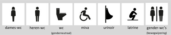 Voor het nieuwe beleid zijn er ook de pictogrammen opgefrist. Genderneutrale wc’s worden aangeduid met een wc-pot. Daar was nog even discussie over, vertelt Van der Velden. “Er was ook een voorstel voor een handenwas-pictogram, maar dat laat niet mijn nood zien. Als ik een toilet zoek, dan zoek ik geen kraantje.” Voor urinoirs en hurktoiletten zijn nieuwe pictogrammen gemaakt en het rolstoelpictogram is bijgewerkt. “Het oorspronkelijke vonden rolstoelers zelf heel statisch en inactief, dus nu zie je op het pictogram iemand in een rolstoel die een beweging maakt.”