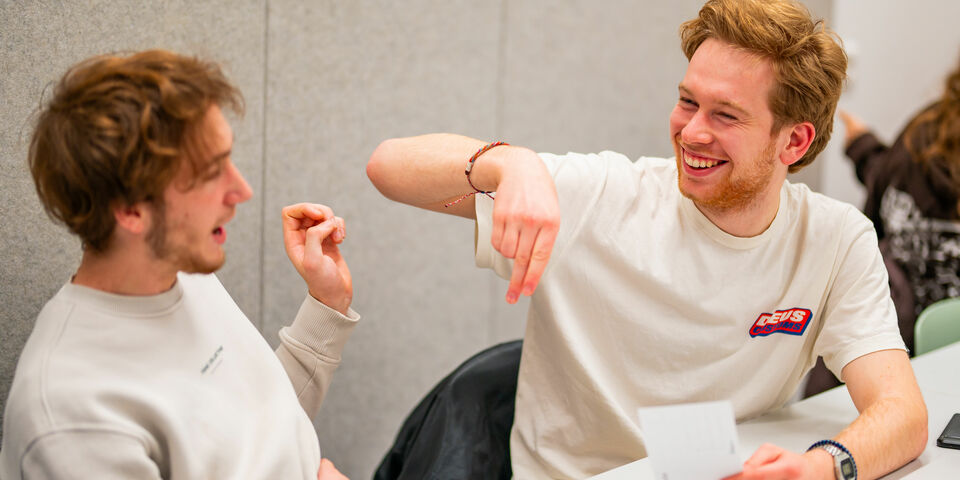 ‘Leer in één avond communiceren met doven en slechthorenden via de Nederlandse Gebarentaal en neem een kijkje in de dovenwereld!’, lokte Studium Generale en snel was de workshop uitverkocht. Dertig studenten kwamen er op een koude natte dinsdagavond voor naar Neuron. Cursor was erbij.