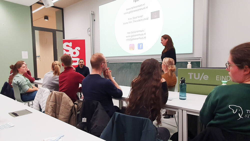 Het initiatief voor deze workshop is genomen door Psychology & Technologystudent Lente Brinksma die als student-assistent bij Studium Generale werkt. “Ik vroeg me af of je kunt studeren met een gehoorstoornis”, zegt ze. “Waar loop je dan tegenaan? Mijn oma is bijna doof en draagt een Cochleair Implantaat.” We hebben net vernomen dat dat beslist geen ideaal apparaat is, de geluiden worden door een drager heel anders ervaren dan door de mensen ernaast. “Ik had in een familieweekend eens een workshop gebaren gehad en stelde dat voor het SG-programma voor.” Vanavond hoorde ze dat er in de wereld één universiteit is voor doven: Gallaudet in Washington DC. Het is SG en Het Gebarenhuis niet bekend of er dove studenten aan de TU/e studeren.