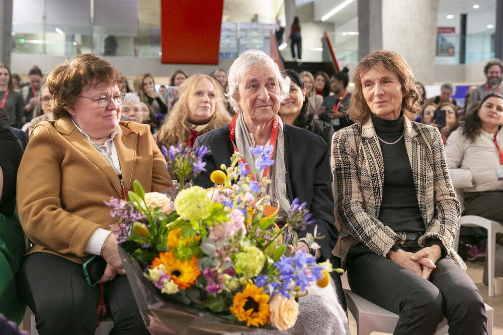 Een andere bijzondere gast van deze middag is Marina van Damme, met 94 jaar de oudste vrouwelijke ingenieur van Nederland. Van Damme was de eerste gepromoveerde aan de toenmalige Technische Hogeschool Twente en heeft zich haar hele leven ingezet om andere getalenteerde vrouwen in de wetenschap te ondersteunen en aan te moedigen. Elk jaar reikt ze een beurs van 9000 euro uit aan jong vrouwelijk talent, en dat op alle vier de technische universiteiten van Nederland. Dit jaar wordt de Marina van Damme-beurs uitgereikt aan TU/e-alumna Marina Pilz da Cunha, die helaas niet aanwezig kan zijn, maar haar dankbaarheid overbrengt via een videoboodschap. Ze geeft aan het geld te zullen gebruiken voor de ontwikkeling van kleurveranderende productlabels die de houdbaarheid in realtime aangeven.