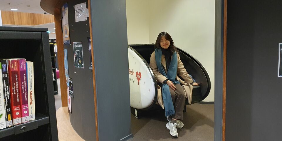 Om op de campus meer prikkelarme ruimtes te creëren, hebben ESA en Library de handen ineen geslagen. Een van de eerste resultaten is nu dat er twee powernap pods zijn geïnstalleerd in de bieb. Wie behoefte heeft aan een moment van rust kan daar – zonder reservering – in kruipen. Student Hazel Lim kruipt er net uit. Ze vertelt waarom een hazenslaapje tijdens een studiedag haar helpt.