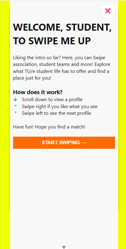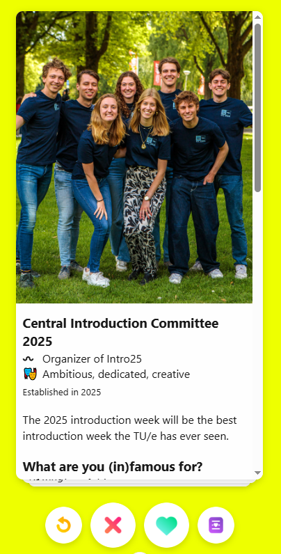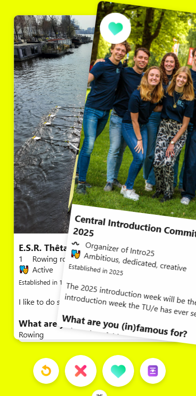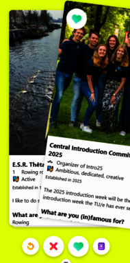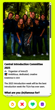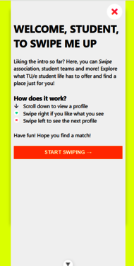 ‘Swipe me Up’ - de officiële naam van het Tinderconcept van de CIC - is daarom zo simpel mogelijk gemaakt. “Zo kunnen introgangers tijdens deze pauzemomentjes rustig swipen”, vertelt Van den Berk. In de app komen verenigingen, studententeams en andere initiatieven voor studenten voorbij. “Net als bij Tinder swipe je links als je denkt ‘niks voor mij’, en rechts als iets je interesseert”, legt hij uit. Wanneer je rechts hebt geswipet dan heb je een ‘match’ en krijg je uitgebreide informatie over het desbetreffende initiatief.