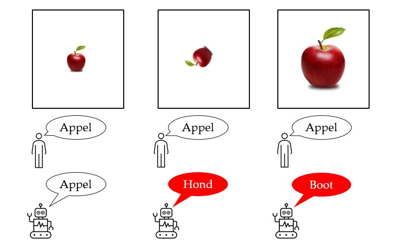 An important problem in image processing is the principle of equivariance. This means that when you transform an image, for instance by moving, rotating, or scaling it, the output must change in a consistent way. Smets shows a series of photos of the same apple. In the second photo, the apple has been rotated, and in the third one it has been enlarged. People immediately recognize it’s the same apple, but for a neural network things aren’t that obvious. “If the model has only seen photos of upright apples, it won’t recognize the rotated apple as such,” says Smets.