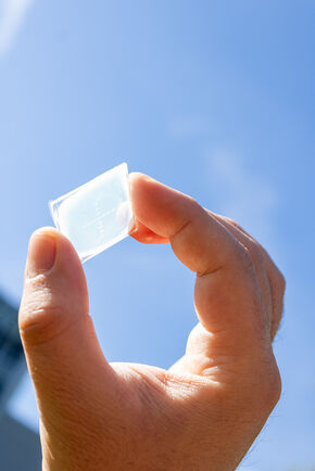 In his office at Helix, crammed with paperwork, Astam pulls the updated prototype – the product of decades of research – out of an ordinary plastic lunchbox sitting on his desk. “Proof that we’re really a startup,” he says with a laugh. He takes out a translucent square, two by two centimeters in size and covered in tiny dots. It’s designed as a coating for screens. The material feels smooth, but when Astam briefly places it on a hot plate, the dots are palpable. Once it has cooled down, the material is smooth again. Astam has also fashioned a ring out of it.