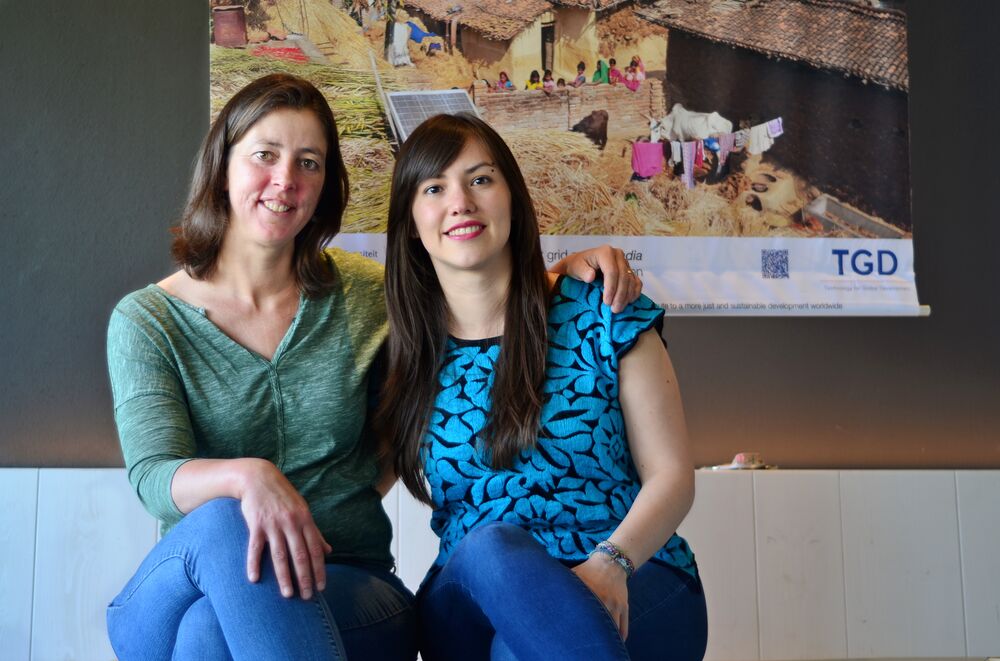 The Mexican Mercedes Fuentes Velasco, a recent graduate of Sustainable Energy Technology, used to work closely with Mariëlle Besling-Dullaert on activities run by Technology for Global Development. They hug when they greet one another.