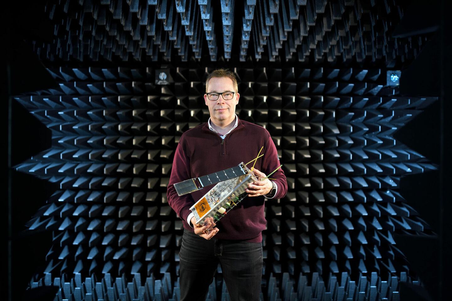 It goes without saying that these great long things cannot be launched in their extended position; they can only take that form in space. So a major challenge is to find the best way to roll up the antennas as small as possible. “Metal measuring tape is not a bad starting point. Though we will probably want to use a lightweight plastic containing a copper or gold wire, or perhaps covered with a conductive spray coating. It is useful that we can test the prototypes here in the TU/e's anechoic room.”