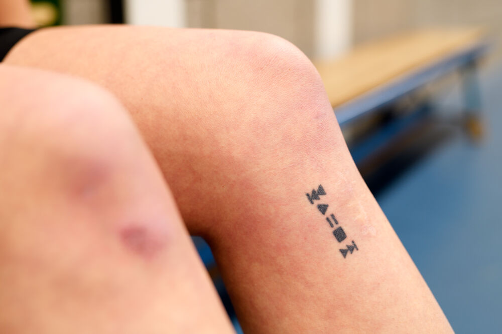 Izy's voyage of self-discovery was marred by an unwelcome companion: bad luck. At the International University Totelos Tournament in May 2014 she tore her anterior cruciate ligament. After twelve months of intensive and difficult rehabilitation she decided to get a tattoo as a memento and incentive. Visible just below her knee it is short and simple: two buttons - stop and start. A symbol of her successful recovery. A way of banishing pain. But most of all, a reminder that staying fit is essential to both body and mind.