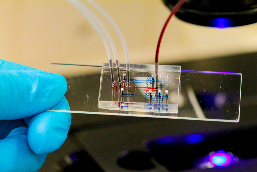 In another experiment, Tel isn't using droplets, but tiny chambers in which the cells can be confined. “We can flow a tiny amount of fluid in there to expose the cells for a set time to certain substances. This is a little more realistic than the tiny droplets. We are currently hard at work getting this system running smoothly.”