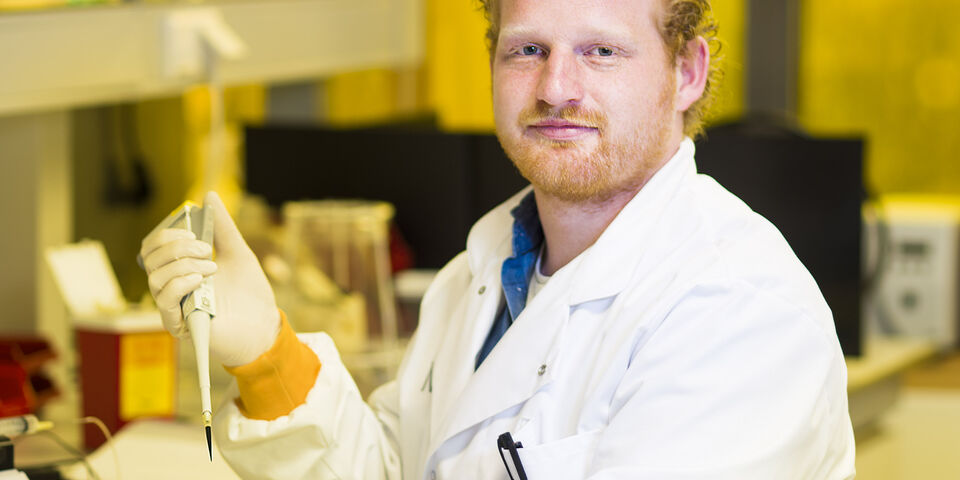 Biomedical Engineering student Michiel Twisk is conducting his graduation research in two groups of different departments. At Chemical Biology (Biomedical Engineering) he made a molecule that you can use to coat gold particles, and at Molecular Biosensing for Medical Diagnostics (Applied Physics and Biomedical Engineering) he is using this molecule to test a new principle for a biosensor.
