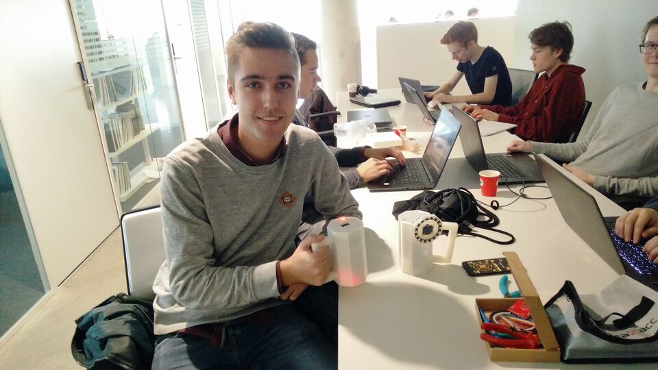 With his group, EE student Arthur Timmermans (see photograph) built two controllers in the form of a beer mug. As the presentation was held in a room on the tenth floor, a video link was useful for the demonstrations. Beer mug in hand, a student walked to the places where there was 'something to eat' and away from places where the enemy was lurking. He could see that from various colored LEDs in the beer mug. “It was really fun to apply what we had learned in practice.”