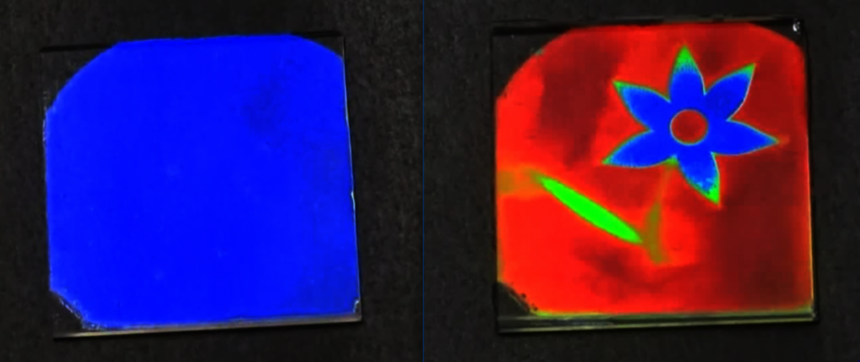 The team used inkjet printing technology and a calcium nitrate solution to print an image on a CLC polymer they developed. Printing successive layers changed the degree of swelling of the CLC polymer, changing the color. One layer resulted in an orange color, a second layer changed it to green, and a third layer made it blue. As an example, the researchers used the method to draw a blue flower with green leaves on a reddish-orange background. After the ink dried, the image was no longer visible—the entire surface appeared blue. However, sprinkling water or breathing on it caused the full color image to re-appear.