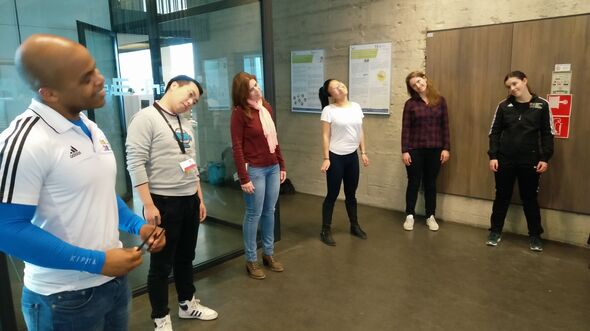 Sport instructor Mitchell de Palm is about to start the seventh Fit Break (in a series of ten) on the eighth floor of Vertigo. Facing him are mostly employees from the Urban Planning Group. Except for just a few, they are internationals who are studying for doctorates here and it is remarkable that there are only two men taking part.