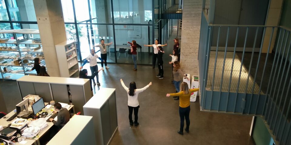 “This really feels very good”, says Van de Sande, voicing the feeling of the whole group. After the 15-minute break the PhD students rush back to their computers again. “We should do this more frequently, but to be honest, if it weren’t for someone like Mitchell taking the initiative, you really wouldn’t do this.” Van de Sande herself goes in for yoga, so she does not need to do it to become limber, “but on a day involving a lot of computer work it is so pleasant to give all the muscles a good stretch. Besides, it is easy enough for anyone to join in and we have a lot of fun while doing this.”
