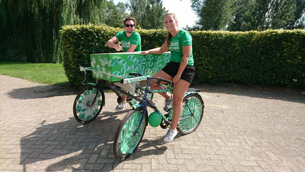 Tennis club Fellenoord is unlucky – during these days that is - to be located rather remote on the sports field. Members Jeroen Vos and Esmée van Let drove back and forth to the entrance with the association’s delivery tricycle – quite a special model - to make the intro kids enthusiastic to join the tennis club, which had a nice attraction in the form of a speedometer. Your reporter made it to an honorable shared second place this afternoon – in the ladies’ scores, that is.