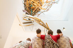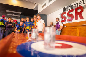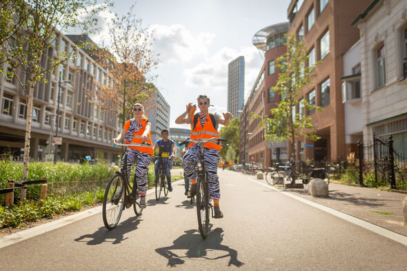 The groups also visit the city center of Eindhoven again today, where they go to the Van Abbe museum and the societies of SSRE, Demos and the Eindhovens Studenten Corps. Visiting the latter association is a bit of a challenge, because the Ten Hagestraat is closed off due to road work and they need to wring with their bikes to get to the society at all. The activities at the associations range from rodeo riding on a beer bottle to a chug competition and from a silent disco to beer shuffling - the latter is done with water, because sacrificing beer for this is some kind of alcohol abuse and "beer does not necessarily make it more fun”, someone from SSRE commented.