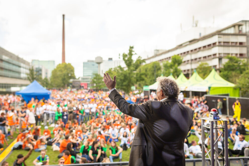 By pushing the red button, the Intro 2019 officially started on Monday afternoon for more than two thousand freshmen. Lex Lemmens, dean of the Bachelor College, urges everyone to study hard from September onwards, but to also relax. Mind-illusionist Jochem Nooyen fooled his audience pretty well.