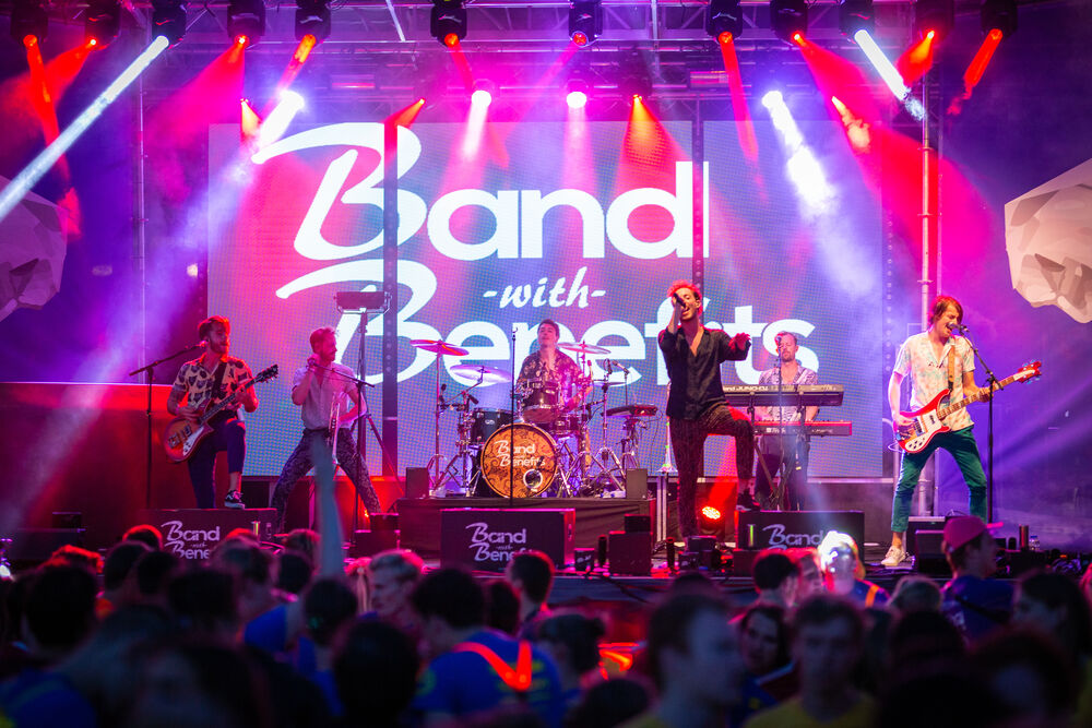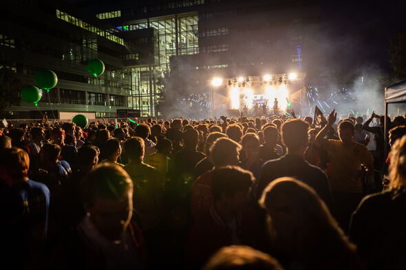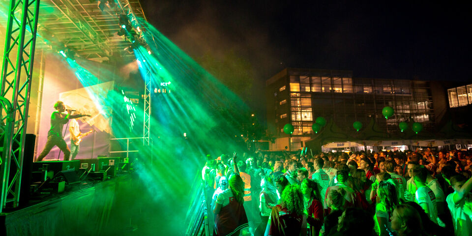 This Intro for new bachelor students involves approximately twenty-five hundred participants (including supervisors), who are ultimately indispensable partners to each other in groups for a week. This Monday they met each other, their departments, the campus and a first glimpse of the city, and then returned to the Flux field for the opening party (with performances by Band with Benefits and Happy Feelings and DJ duos Pep & Rash and Lampegastuh).