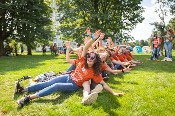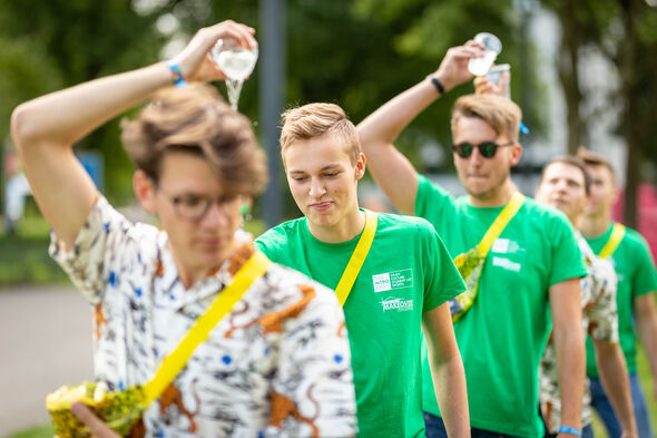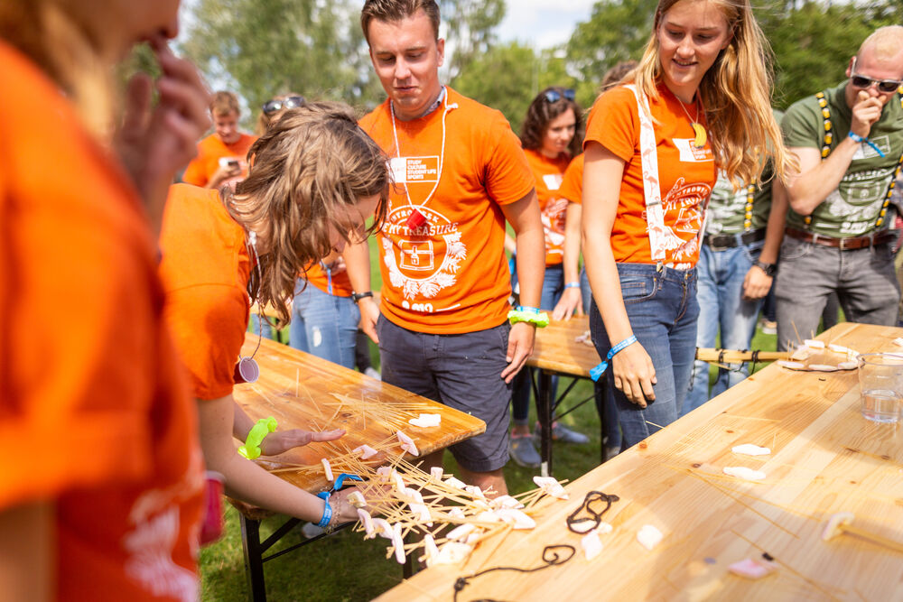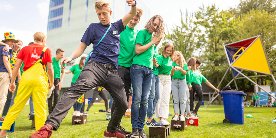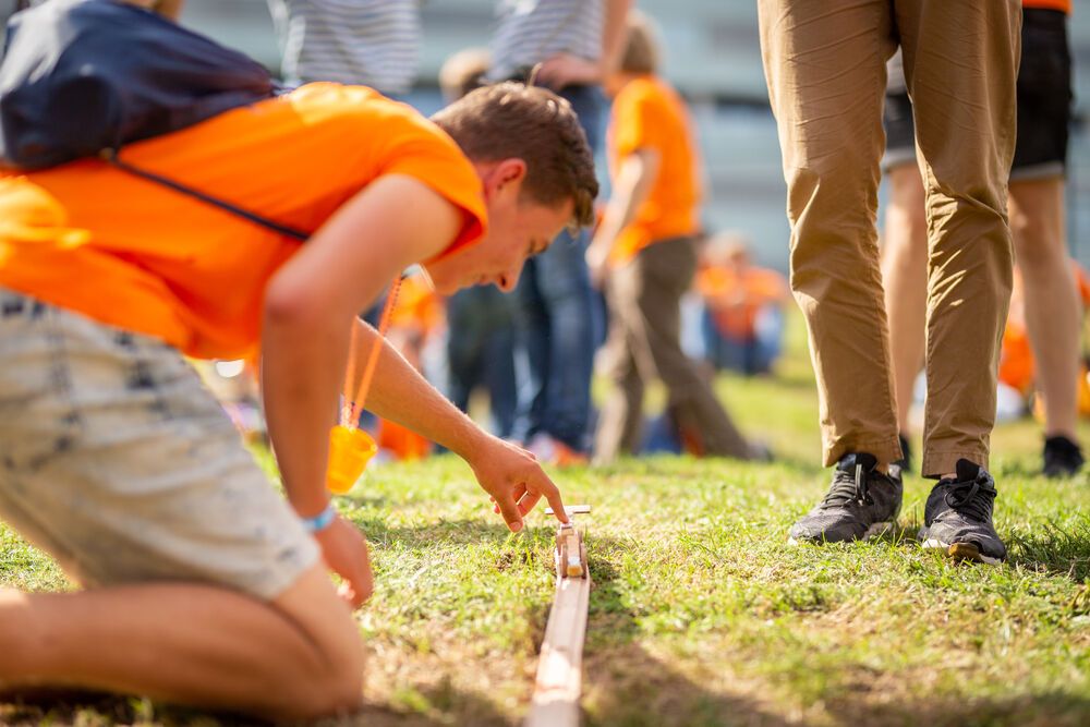 The two hundred architects-to-be can earn points in fifteen games to buy building materials for the large avoid-the-fire-extinguishing-jet game in collaboration with the fire brigade. Building bridges with beer crates, playing memory with photos of buildings and teachers and laying out the words ‘steel’, ‘study’ and ‘week’ with their bodies are study-related enough, according to the CHEOPS introduction committee.