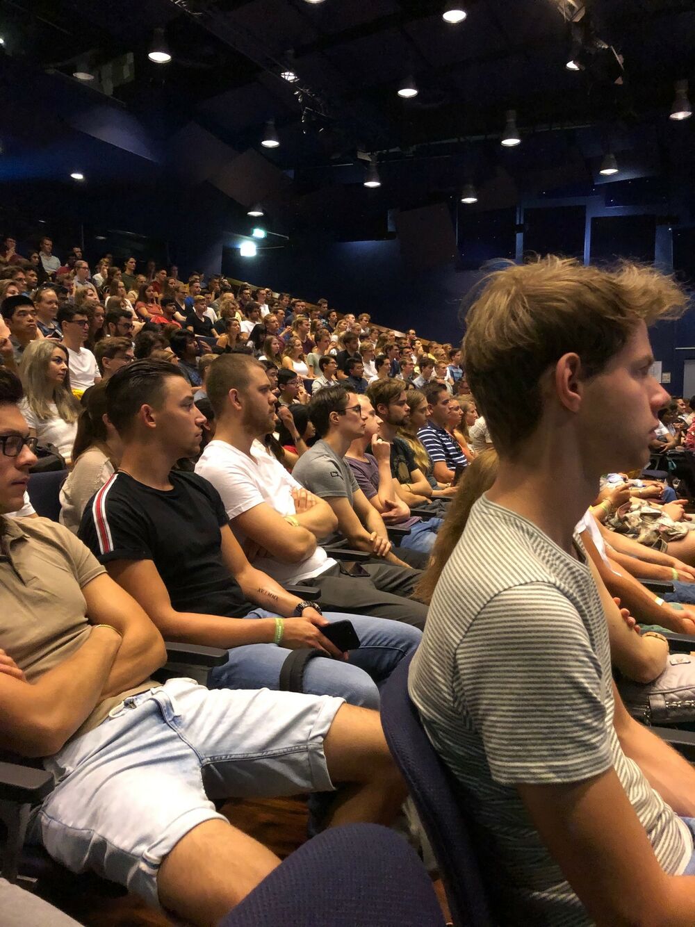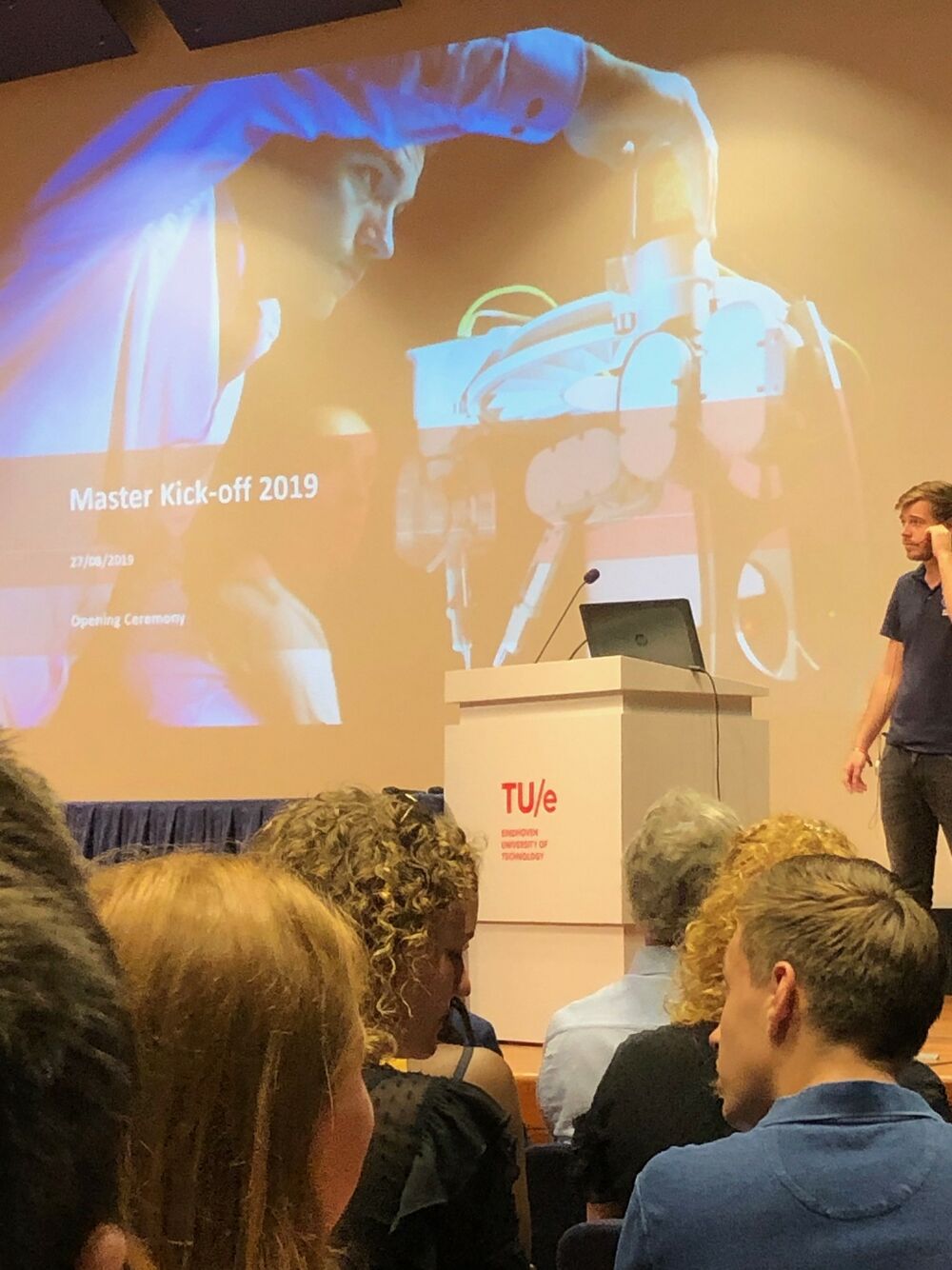 With such a high number of participants, it was decided to digitally loop the opening ceremony to two lecture halls. A rapid stream of information comes at the new Master's students. In his words of welcome, Dean Paul Koenraad advises the participants to do what he himself did during his vacation: spread their wings and push their boundaries. He illustrates his point with a vacation photo showing himself hang gliding. Afterwards, speeches are given by representatives of the Skillslab, the Career Academy, Recruitment Days, and Studium Generale, and the CIC gives more details of the event program.