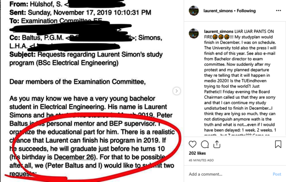 The university emphasizes that Laurent was given no concessions in terms of the quality demanded of his program. 'His study pathway has been in accordance with the Education and Examination Regulations of the Bachelor's program in Electrical Engineering. Laurent was required to successfully complete the same practicals as other students, and he was required to study the same courses and sit the same exams. The university did, however, accommodate him with regard to timing: Laurent Simons was allowed to sit exams at unique times and to complete practicals at an accelerated pace. This required additional work of many people at TU/e, because all the exams and practicals arranged for Laurent had to take place separately. Not, it should be said, that this is unusual. Provided they have good grounds, special students, those who are competing at a high level, for example, may be given their own adapted schedule.'