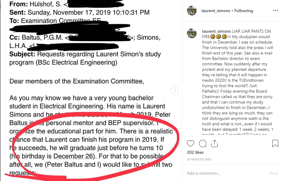 In the meeting it was proposed that the schedule be relaxed a little, so that Laurent gains his bachelor's degree at TU/e in mid 2020, says the university. 'This remains, in every respect, a phenomenally fast schedule. In our view, this timeline offers Laurent the chance to sufficiently develop the skills associated with last phase of the program, such as insight, creativity and critcal analysis, without excessive pressure being put on this nine-year-old student. We are of the opinion that a faster schedule is not feasible, and is deterimental to Laurent's academic development.'