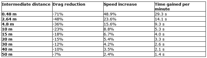 Blocken investigated the drag using two methods that independently show the same results: computer simulations and measurements in the TU/e wind tunnel. A rider who cycles at a distance of approximately 2.5 meters from a motorcyclist experiences up to 48 % less drag. If he or she would ride at 54 km/h without motorcycle, the presence of the motorcycle will allow him or her to ride at about 67 km/h. This provides a time gain of 14.1 seconds every minute. This advantage becomes smaller as the distance increases, but at a distance of 50 meters a 7% reduction is still measurable. This represents a gain of 1.4 seconds per minute at a reference speed of 54 km/h. At reference speeds above 54 km/h, the time gain is even bigger.
