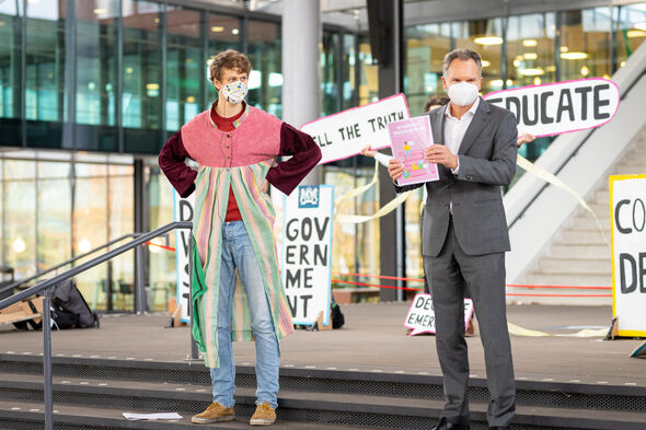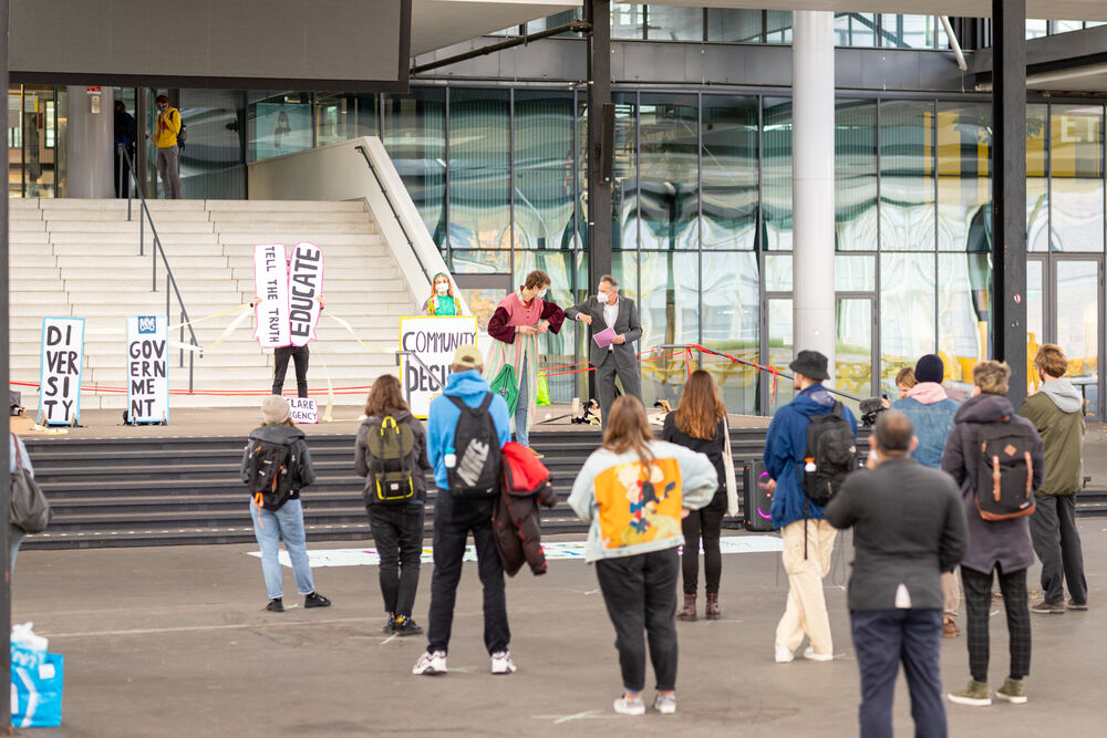 Activist and TU/e Master’s students Bram Boer read a summary of the manifesto on the stairs of MetaForum. “Universities have a duty to teach students about ecology and the climate crisis, and about what the consequences will be if we fail to take action now. We demand that the campus will be carbon neutral by 2025, and that TU/e severs its ties with Shell and other oil companies.”