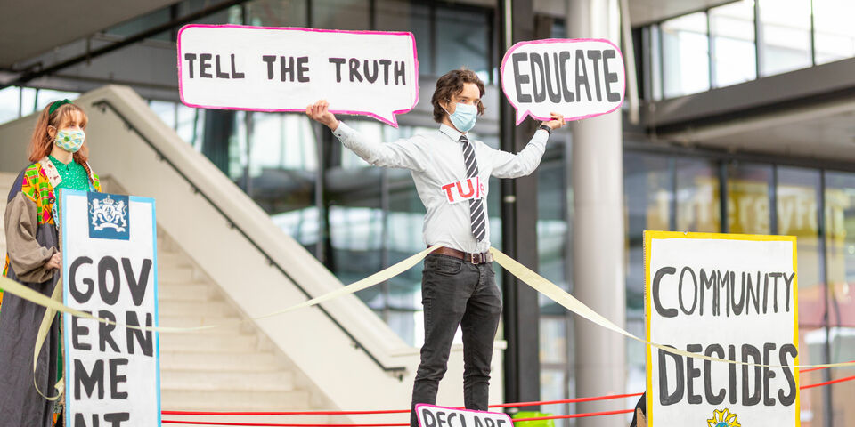 Robert-Jan Smits, president of TU/e’s Executive Board, listened to action group University Rebellion Eindhoven this afternoon. The group had invited him to accept their manifesto, in which they urge the university to commit to carbon neutrality and to sever its ties to fossil fuel industry. Similar groups demanded attention to climate change at twelve universities today.