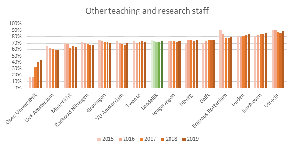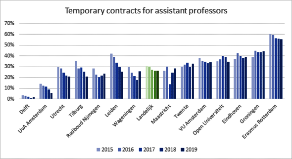 A quarter of all assistant professors continue to work on a temporary basis. The same applies to three quarters of other teaching and research staff. PhD candidates all have contracts for a set number of years; in the Netherlands that is the nature of these appointments.