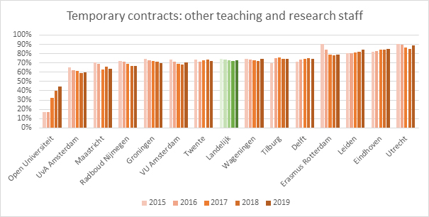 Similar differences can also be seen for postdocs and other teaching staff. At the University of Amsterdam, 59 percent of this group have a temporary contract: while this may seem high, at Utrecht University that figure is 90 percent.