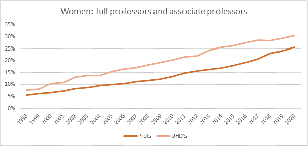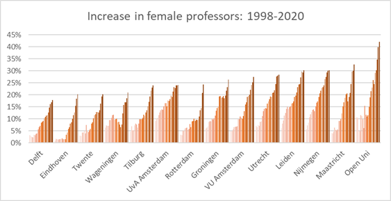 It is worth noting that the number of female professors rose at all universities over the past year, even if you have to look behind the decimal point to see these results for Nijmegen: the gains from 2019 to 2020 only came to 0.05 of a percentage point.