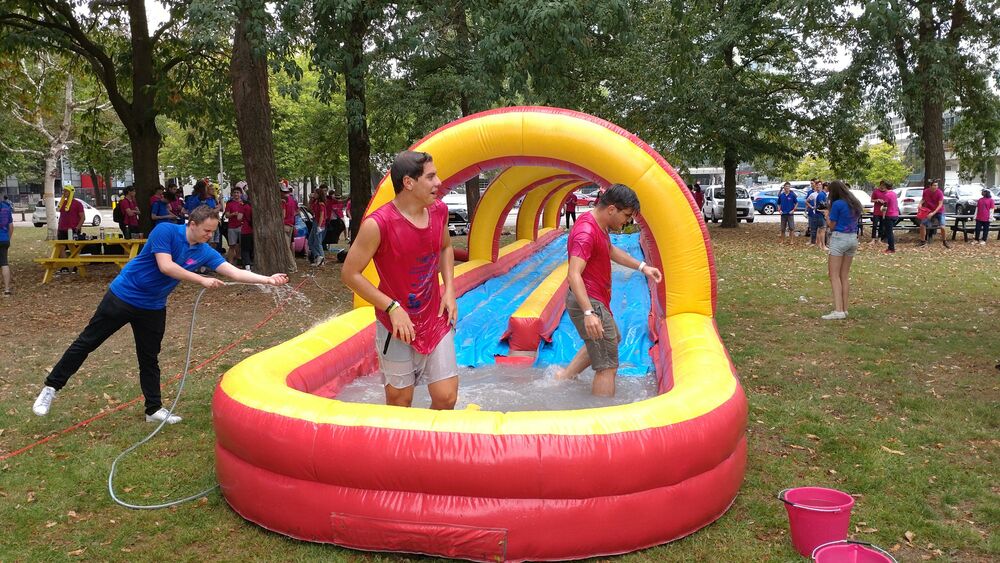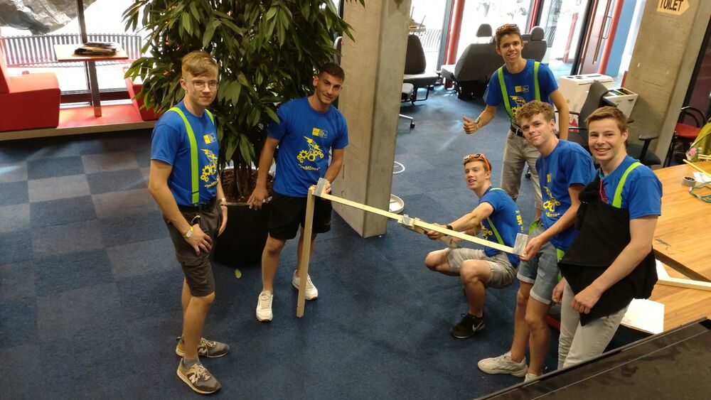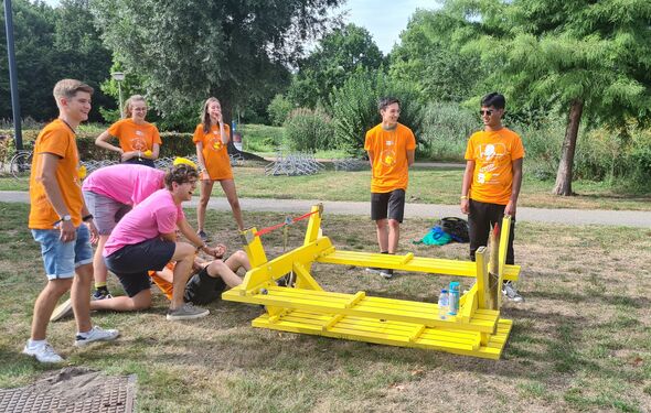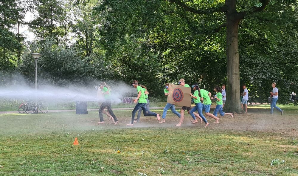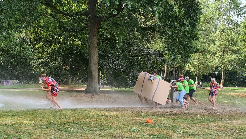 For example, Thor (Electrical Engineering) combined the creation of a wireless network with a lot of fun on the inflatable water track and the future physicists relaxed in the sun with their catapults which they made (or borrowed) themselves. The mechanical engineers of W.S.V. Simon Stevin built a similar weapon, which they will test on Tuesday morning. On the KOE field, the campus fire department had been called out to spray the future engineers with the firehose at full blast. Some groups were so desperate to cool off that they simply stopped using their cardboard shields for protection. A brave thing to do, because that jet really hits hard.