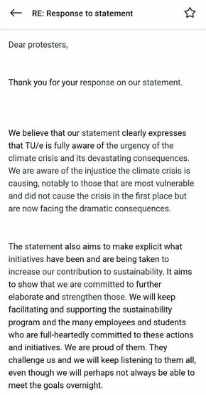 University Rebellion and End Fossil Occupy also published a major statement this evening in response to the TU/e Board's statement. In it they express their gratitude for the acknowledgment of the climate crisis by the EB, but also say that a lot still needs to happen, such as a concrete commitment on how the transparency of the third funding stream will be achieved. They also provide a broad explanation with a scientific framework as to why ties with the fossil industry must be cut.