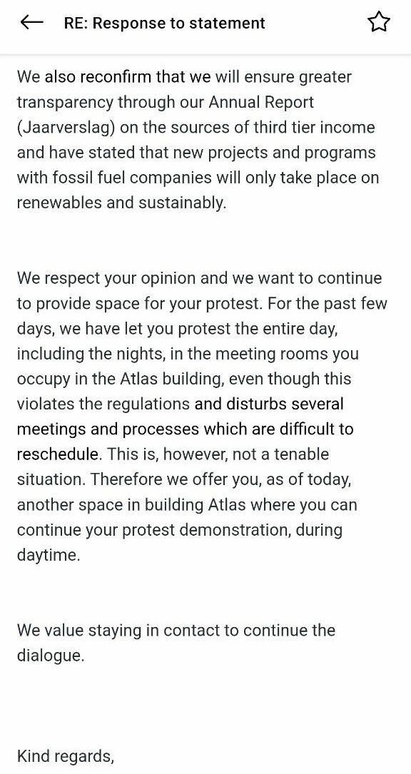 End Fossil Occupy: “We are tired and at the same time we have a lot of energy. That is because of the victory: the climate crisis has never before been recognized as a problem by the Executive Board and now it is. We have enough energy to show up again next week, especially now that we have negotiated to keep the space longer. The atmosphere is cheerful here, we are cleaning up a bit and will sleep in our own beds for the next two nights. And we will be here again on Monday at 7 AM sharp.”