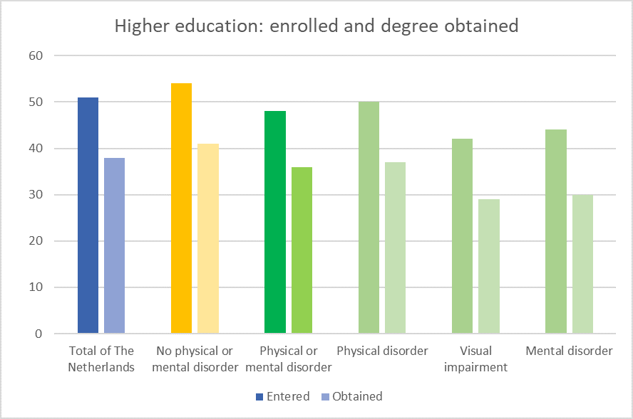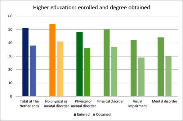 Among those people with no disability issues, 54 percent studied in higher professional education (HBO) or research-oriented higher education (WO) and 41 percent ultimately graduated. Of people with a disability, 48 percent entered higher education and 36 percent got over the finishing line.